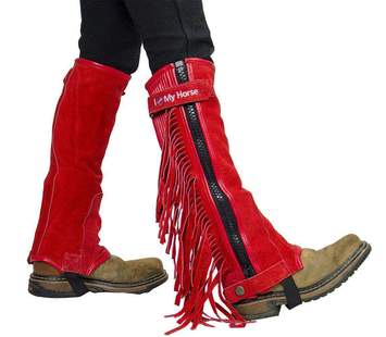 TAHOE TACK KID'S SUEDE LEATHER MULTI PURPOSE "I LOVE MY HORSE" HALF CHAPS WITH FRINGES FOR HORSEBACK RIDING OR MOTORCYCLE USE